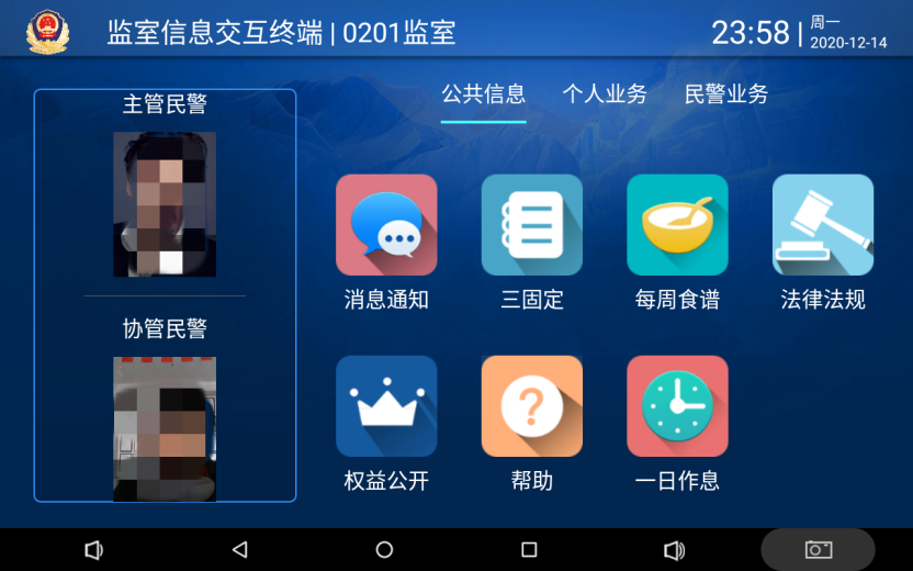 產(chǎn)品簡(jiǎn)介:針對(duì)被監(jiān)管人員的管理是監(jiān)所工作的重中之重,除了談話教育、巡視等主動(dòng)管理,被監(jiān)管人員發(fā)起的訴求,如:就醫(yī)、購(gòu)物、約見、點(diǎn)名及信息發(fā)布等也是管理工作的重要組成,常規(guī)的管理模式存在身份確認(rèn)手段匱乏,信息登記繁雜,準(zhǔn)確性和及時(shí)性較差等特點(diǎn),使得民警管理工作效率大打折扣,同時(shí)民警的憊懶心理也客觀存在,記錄不全、處理不及時(shí)的情況無(wú)法得到監(jiān)督。鑒于此,監(jiān)所將建立一套監(jiān)室信息交互系統(tǒng),在體現(xiàn)對(duì)被監(jiān)管人員合法權(quán)益的保護(hù)和尊重的同時(shí),也使得民警業(yè)務(wù)管理得到便捷,輔助民警高效準(zhǔn)確的開展管理工作,展示監(jiān)管民警的良好形象,真正實(shí)現(xiàn)監(jiān)管手段的信息化。
